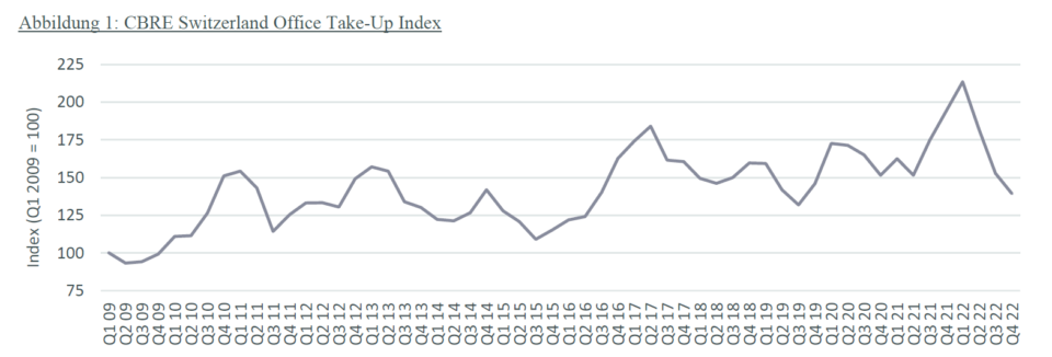 CBRE Switzerland veröffentlicht den aktuellen Office Take-Up Index mit Zahlen vom Q4 2022 (vgl. Abbildung 1). Der Index beruht auf den Inserateabschaltungen auf den ImmobilienOnline-Marktplätzen und zeichnet quartalsweise das Volumen der am Schweizer Büromarkt vermieteten Flächen nach.