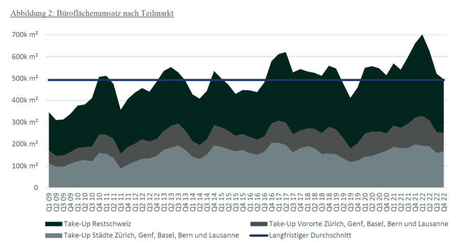 Im Jahr 2023 können dank der nach wie vor sehr positiven Arbeitsmarktsituation insgesamt stabile Flächenumsätze im Bereich des Langfristmittels erwartet werden, allerdings dürften sich die geografischen Akzentuierungen zwischen den Zentren und der Peripherie weiter verstärken.