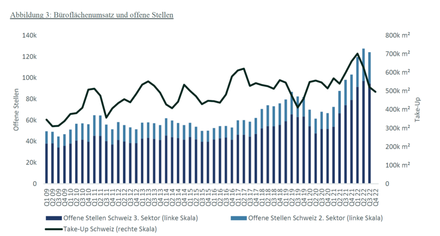 Die registrierten Büroflächenumsätze von rund 500’000 m2 im Q4 2022 haben nach den Höchstwerten von Mitte 2021 bis Mitte 2022 wieder das Vor-Corona-Niveau erreicht (vgl. Abbildung 2). Dies ist auf die allmählich verpuffenden Nachholeffekte sowie das sich verlangsamende Wirtschaftswachstum zurückzuführen. Viele Unternehmen haben die während der Corona-Zeit noch aufgeschobenen Umzugspläne nachgeholt bzw. sich an ihre neuen Standort- und Flächenbedürfnisse angepasst. Gleichzeitig hat der Stellenmarkt wohl seinen Zenit überschritten (vgl. Abbildung 3), und mit den nun fortgeschrittenen Erfahrungswerten im Umgang mit dem Home-Office schlägt das Stellenwachstum nicht mehr eins zu eins auf die Flächenabsorption durch. Neu geschaffene Stellen kommen mit weniger zusätzlicher Bürofläche aus, als dies noch vor Corona der Fall war, und können dank neu gewonnenen Flächenreserven manchmal sogar in den bestehenden Büros untergebracht werden.
