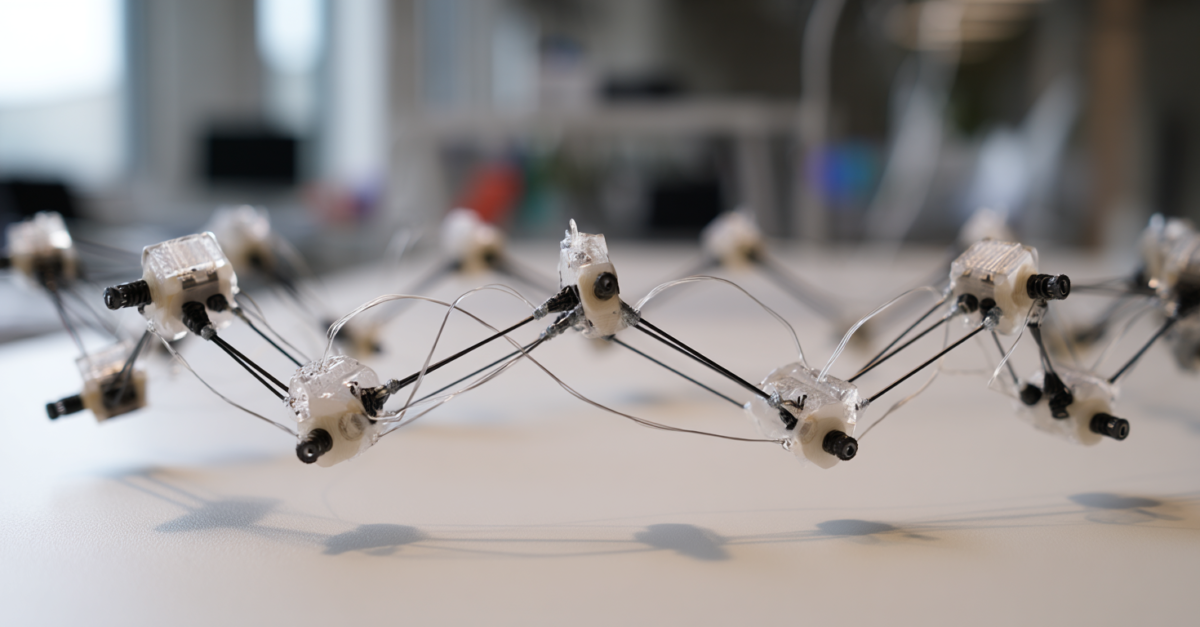 Das Material besteht aus einer Kette identischer Gelenke, verbunden durch ein elastisches Gerüst. Ein integrierter Mikrocontroller misst die aktuelle Position, speichert vergangene Zustände und tauscht Informationen mit benachbarten Elementen aus. Das Gesamtverhalten entsteht aus dem Zusammenspiel vieler einfacher Einheiten. Genauso wie bei einfachen Organismen, die ohne komplexes Gehirn auf ihre Umgebung reagieren.