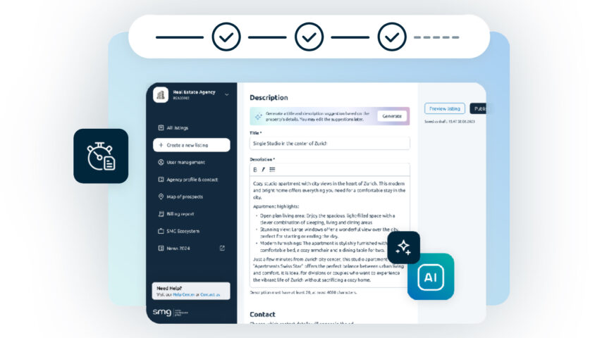 Beim Ziel, Makler:innen und Bewirtschafter:innen nicht nur effizienter, sondern nachhaltig erfolgreicher zu machen, wirkt Künstliche Intelligenz wie ein Booster. Sie beschleunigt die Entwicklung innovativer Produkte, die für Immobilienprofis echten Mehrwert schaffen und wertvolle Zeit gewonnen werden kann – Zeit für die persönliche Beratung und Betreuung ihrer Kund:innen. Ein konkretes Beispiel: Dank der KI-basierten Inseratetexterstellung im Business Manager sparen Immobilienprofis bei SMG Real Estate im Schnitt 14 Minuten pro Inserat.