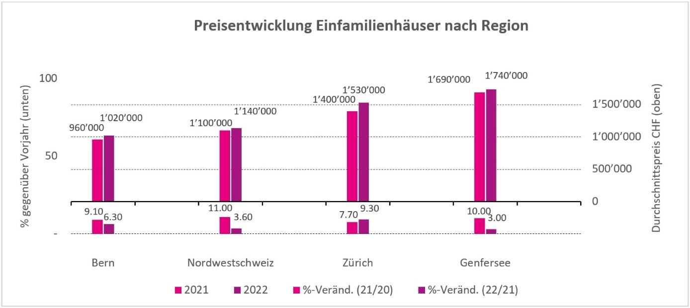 Avec une forte croissance des prix de 9,3%, c’est dans la région de Zurich que les prix des maisons individuelles ont le plus augmenté en 2022 – et c’est même la seule région où les prix ont plus augmenté qu’en 2021 avec une hausse de 7,7%. La région zurichoise a ainsi rattrapé son retard sur la région lémanique, qui reste la plus chère : l’écart avec le prix moyen d’une maison individuelle dans la région lémanique s’est réduit de 80 000 francs, soit 28% par rapport à l’année précédente. Dans la région du lac Léman, un objet moyen coûtait 1,74 million de francs suisses en 2022, soit 3 pour cent de plus qu’en 2021. Dans les régions de Berne et de la Suisse du Nord-Ouest, les prix moyens des objets pour maisons individuelles se sont également quelque peu rapprochés, puisque les prix dans la région de Berne ont enregistré une augmentation presque deux fois plus importante (6,3 pour cent à 1,02 million de francs suisses) que dans la région de la Suisse du Nord-Ouest (3,6 pour cent à 1,14 million de francs suisses). Si l’on tient compte de l’inflation de l’année dernière, la hausse des prix n’est donc que minime pour la Suisse du Nord-Ouest (0,8 %). Néanmoins, Berne reste la région la moins chère pour acheter une maison individuelle.
