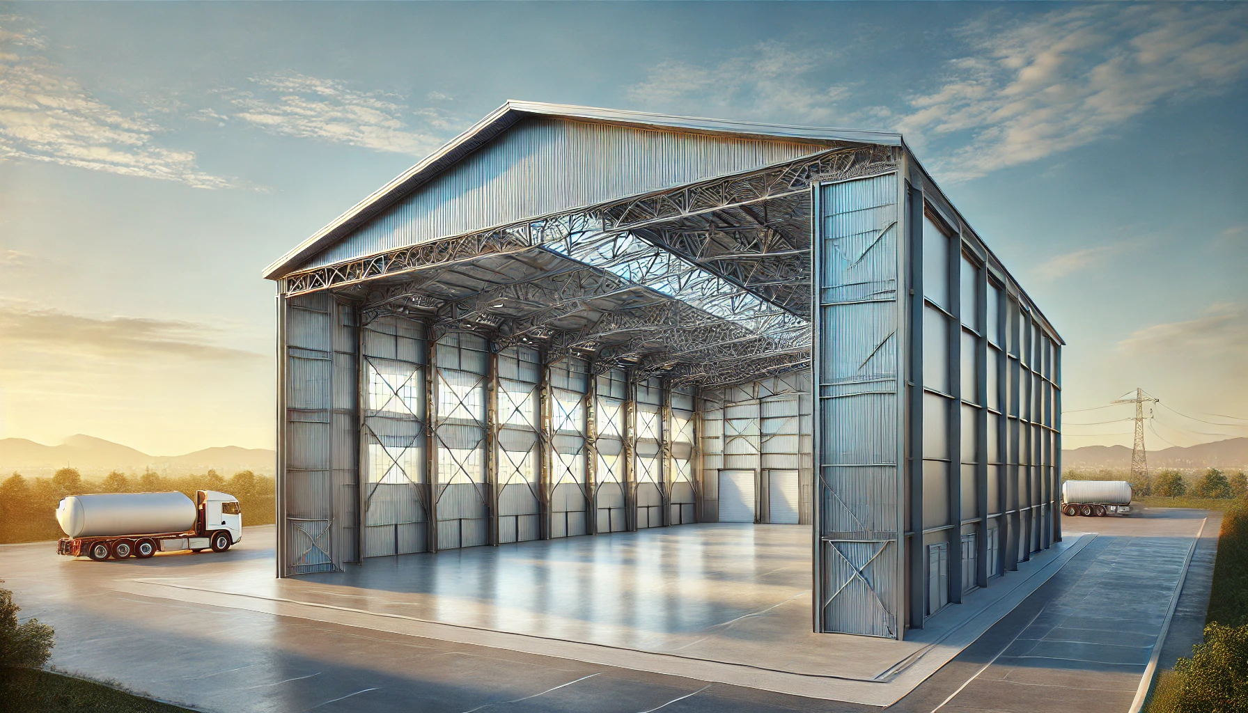 La façade du hall est conçue avec des éléments sandwich de Montana Bausysteme, le toit est constitué d’une cassette de tôle isolée de la même entreprise. La hauteur de la salle varie entre 6 et 8 mètres. Les autres caractéristiques mentionnées dans l’article sont deux grandes portes, une structure métallique intérieure avec galerie et un grand lanterneau.