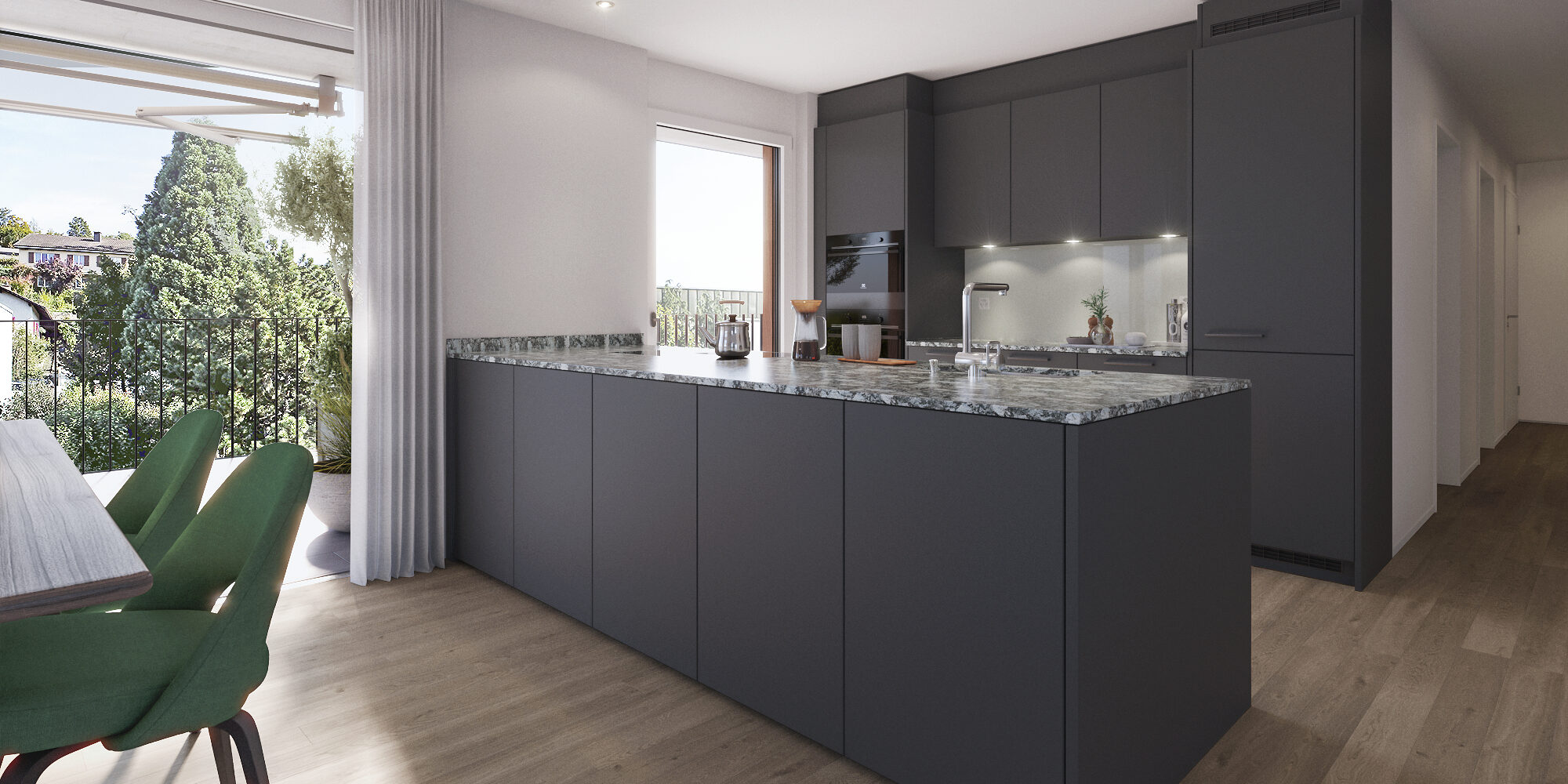 Trois lignes de conception différentes sont disponibles. Les lignes de base peuvent être combinées entre elles et les revêtements de sol, les façades de cuisine ou les carreaux de salle de bains peuvent être choisis dans différents matériaux ou couleurs. Le choix d’un WC douche ou d’une mise à niveau des appareils électroménagers est proposé en option, par exemple. Le configurateur numérique guide le futur locataire tout au long du processus de sélection et reflète directement le surcoût engendré par la location personnalisée.