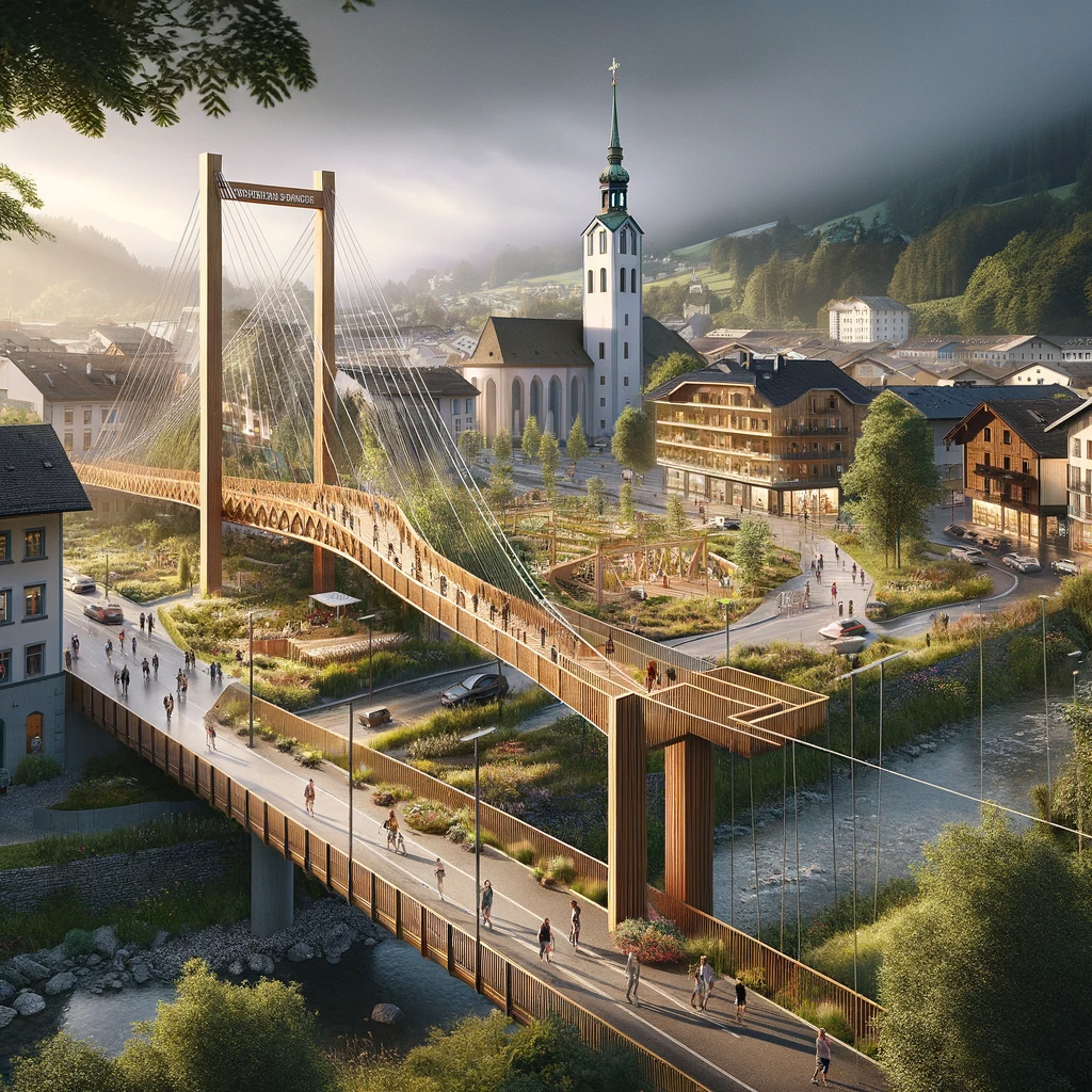 La nouvelle passerelle suspendue avec pylône doit traverser la Bahnhofstrasse et faire office de prélude et de porte d’accès au futur parc. Le parc prévu doit servir de point de rencontre et d’espace de détente à la population et contribuer à la mise en réseau écologique, à la biodiversité et à la gestion durable de l’eau, ajoute le communiqué. Le concept innovant de la passerelle vise à offrir aux piétons et aux cyclistes une liaison directe et attrayante à travers le centre de Spreitenbach.