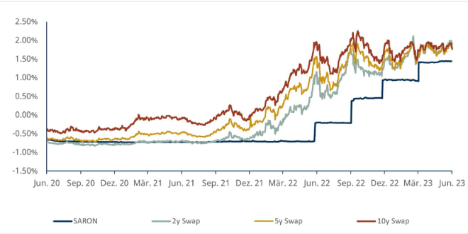 Nach turbulenten Zeiten im Bankensektor, die eine aussergewöhnliche Volatilität bei den Hypothekarzinsen mit sich brachten, zeigen sich die vergangenen Monate als eine relativ ruhige Periode. Inzwischen hat sich die Kurve der Hypothekarzinsen gänzlich abgeflacht, wobei die SARON-Hypothek immer noch günstiger ausfällt als eine Festhypothek. Die Hypothekarzinsen bleiben gegenüber dem jeweiligen Referenzzinssatz weiterhin hoch. Das liegt am erhöhten Risiko am Finanzmarkt und an der restriktiven Kreditvergabe der Banken.