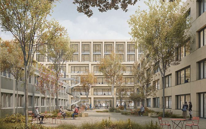In termini di costruzione, “Insieme” si basa su una combinazione di edifici esistenti e costruzioni in legno. Nell’ala B, a parte il seminterrato, l’edificio esistente è stato smantellato e ampliato con un soffitto a nervature in legno per creare un edificio di sei piani. Il progetto dello spazio aperto risponde al clima caldo, ombreggiando la scala esistente e arricchendola con ulteriori piante e posti a sedere. Ai margini del bosco saranno realizzate nuove aree ricreative e piantumazioni di alberi sciolti, che aumenteranno notevolmente la qualità dello spazio esterno.