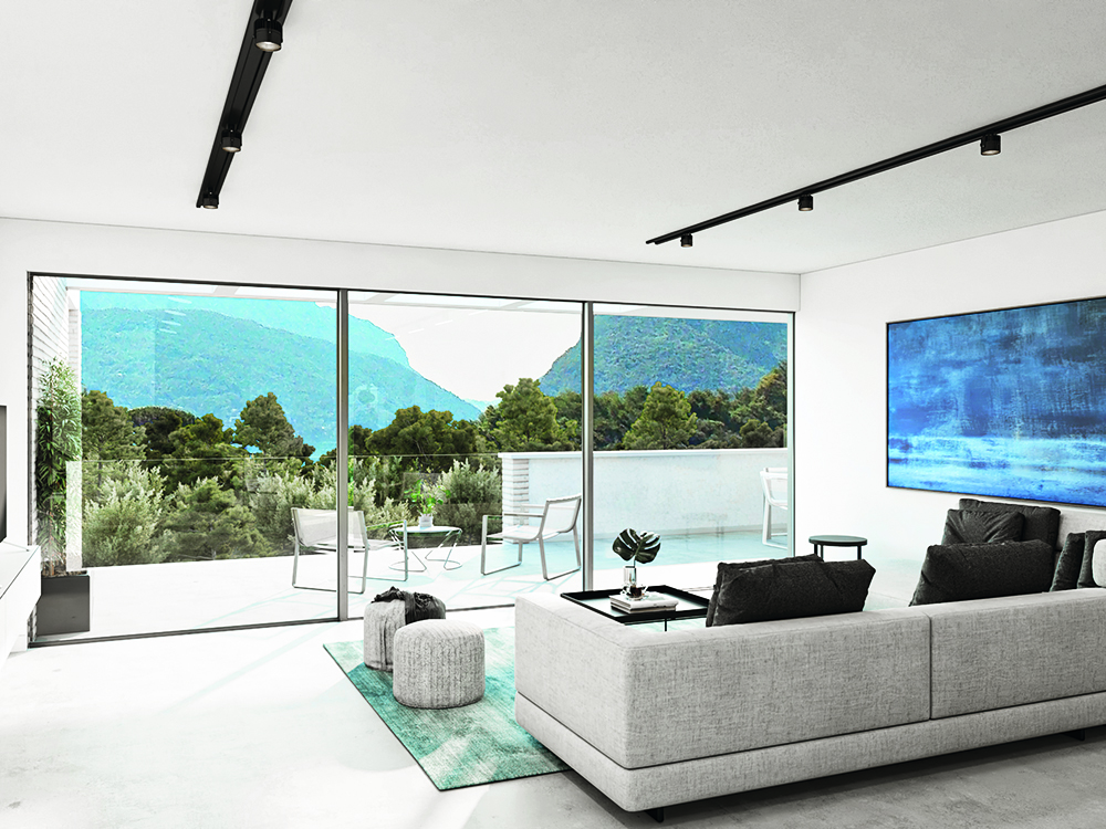 L’organizzazione degli spazi è ottimizzata per permettere di diffondere la luce naturale all’interno degli appartamenti generando un interessante gioco di luci e di relazioni visive verso il paesaggio circostante. La zona giorno infatti si sviluppa su tutta la profondità dell’edificio aprendosi verso le due facciate principali a est e ovest.