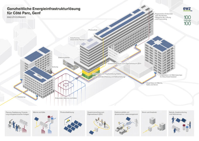 Ein interessantes Praxisbeispiel hierfür ist das Projekt «Côté Parc» in Genf. 776 Photovoltaikpanels auf den Dächern des Areals bilden die Grundlage für eine integrierte Solarlösung mit Wärmepumpen, Ladestationen für Elektroautos und eigenem Arealstromnetz inklusive Eigenverbrauchslösung für die Nutzenden.