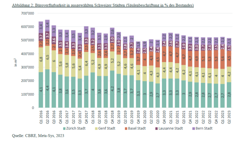 Die schweizweit innerhalb von drei Monaten verfügbaren Büroflächen sind per Ende Juni im zweiten Quartal in Folge auf 1,67 Mio. m2 bzw. 3,5% des Bestandes angestiegen (vgl. Abbildung 1), nachdem sie im Q4 2022 mit einem Wert von 3,2% ein mehrjähriges Tief erreicht hatten. Dies ist vor allem einem zusätzlichen Büroflächenangebot in den Vororten von Zürich (Flughafenregion und Limmattal) geschuldet, wo die Verfügbarkeitsquote innert Halbjahresfrist von 15% auf 16,6% angestiegen ist.