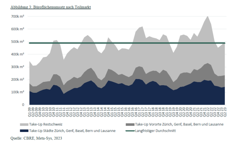 Ansonsten zeigen sich die Büroflächenmärkte der anderen Schweizer Städte Genf, Bern und Lausanne stabil und damit unbeeindruckt vom sich verlangsamenden Wirtschaftswachstum. Der Schweizer Büromarkt hat in den letzten Jahren von hohen Flächenumsätzen profitiert, das gute Wirtschaftswachstum hat die Auswirkungen der Heimarbeit sogar überkompensiert. Allerdings hat sich die Büronachfrage zuletzt aufgrund der abschwächenden Konjunktur verlangsamt, und auch Untervermietungsaktivitäten haben zugenommen. Der Büroflächenumsatz im ersten Halbjahr 2023 ist gegenüber dem ersten Halbjahr 2022 um 28% auf durchschnittliche 490’000 m2 pro Quartal zurückgegangen und dürfte auch im zweiten Halbjahr 2023 auf diesem tieferen Niveau, das ungefähr dem langjährigen Mittel entspricht, verharren (vgl. Abbildung 3).